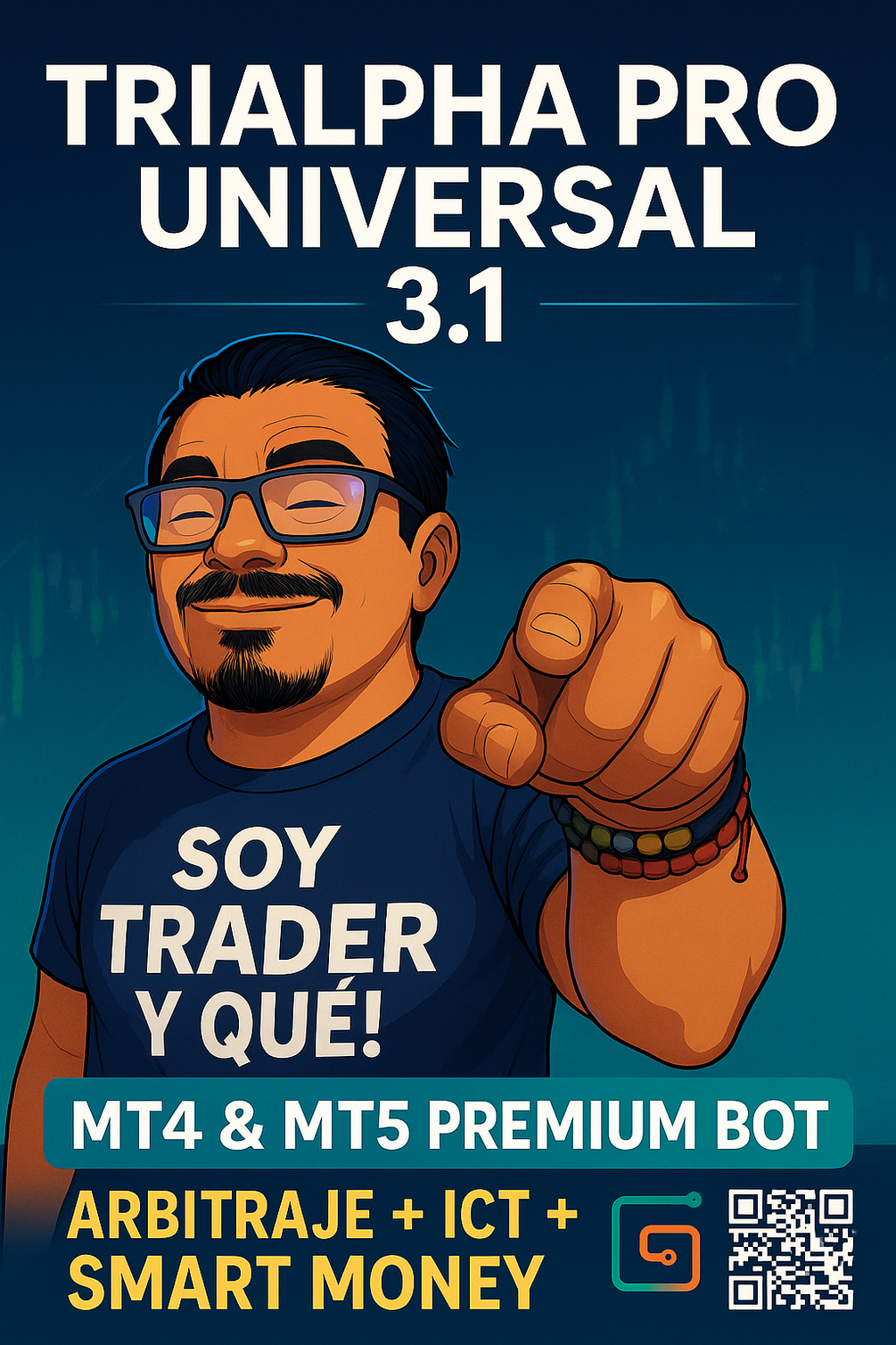 Bot de trading institucional compatible con MetaTrader 4 y 5. TriAlpha Universal 3.1 combina estrategias de arbitraje triangular, ICT, Smart Money y Ali Khan, con gestión de riesgo automatizada. Ideal para fondeo, cuentas reales y scalping profesional.